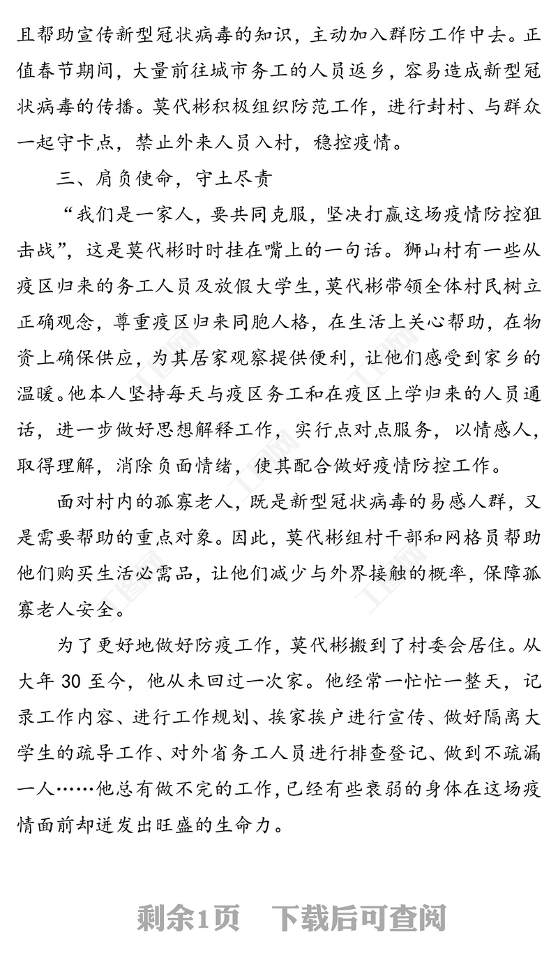 首頁(yè) > WORD文檔 > 疫情防控 > 疫情就是命令,防控就是責(zé)任-疫情防控黨員先進(jìn)事跡之莫代彬先進(jìn)事跡材料.DOCX 【圖片、文字、動(dòng)畫(huà)均可編輯】