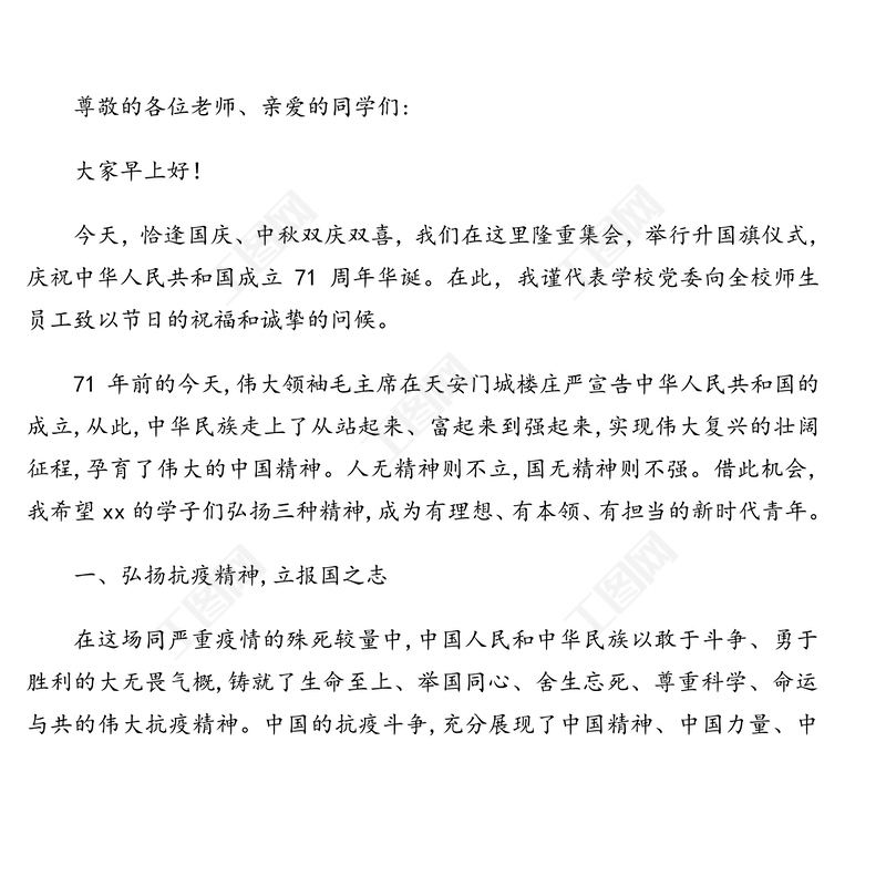 工圖網(wǎng)提供發(fā)言材料:在國慶升旗儀式上的講話匯編(4篇)供會員免費(fèi)下載。更多精彩黨課PPT素材,盡在工圖網(wǎng)。