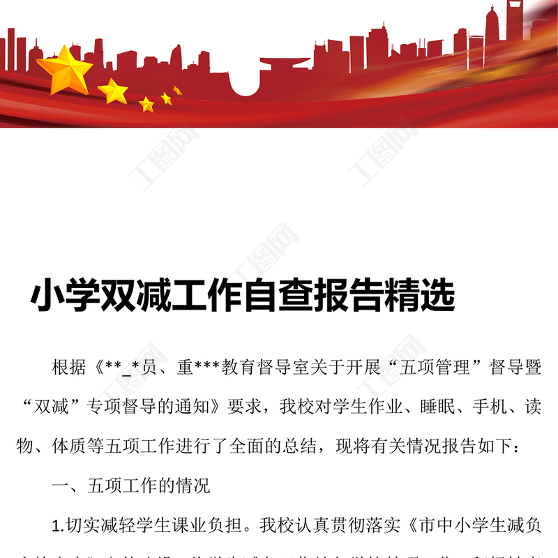 工圖網(wǎng)提供小學(xué)雙減工作自查報告精選供會員免費下載。更多精彩黨課PPT素材,盡在工圖網(wǎng)。