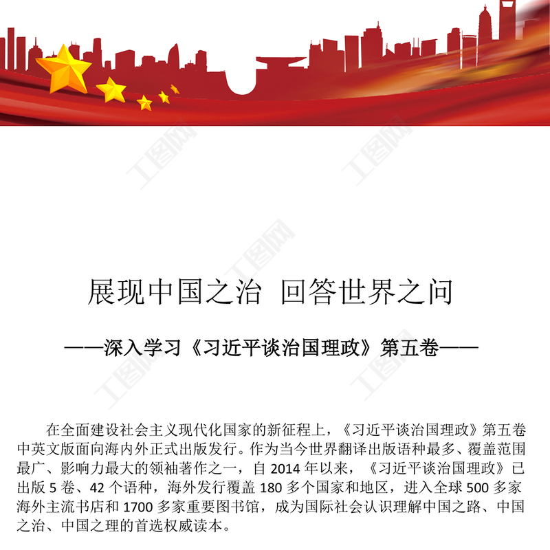 工圖網提供展現中國之治回答世界之問PPT紅色精美深入學習《習近平談治國理政》第五卷(講稿)供會員免費下載。更多精彩黨課PPT素材,盡在工圖網。