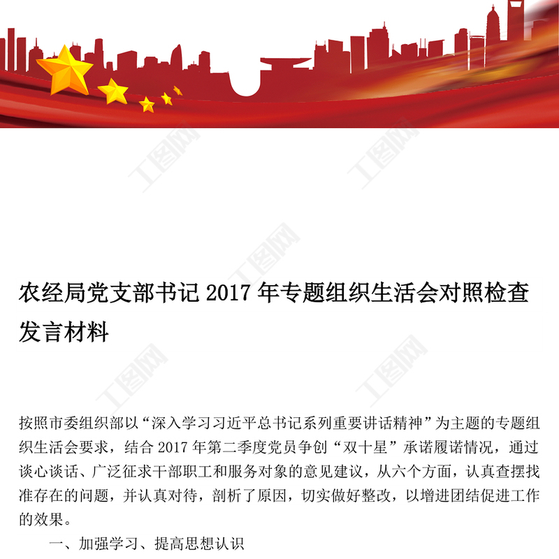 工圖網(wǎng)提供農(nóng)經(jīng)局黨支部書記2017年專題組織生活會(huì)對(duì)照檢查發(fā)言材料供會(huì)員免費(fèi)下載。更多精彩黨課PPT素材,盡在工圖網(wǎng)。