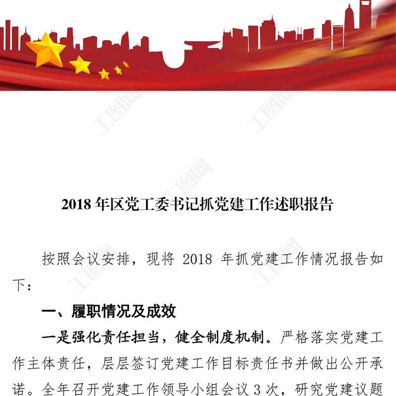 工圖網提供2018年區黨工委書記抓黨建工作述職報告供會員免費下載。更多精彩黨課PPT素材,盡在工圖網。