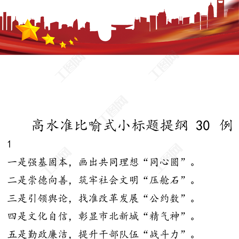工圖網(wǎng)提供高水準比喻式小標題提綱30例供會員免費下載。更多精彩黨課PPT素材,盡在工圖網(wǎng)。