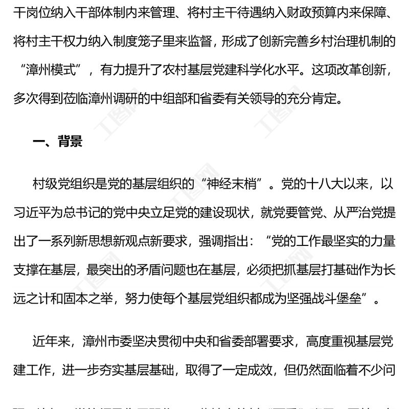 工圖網提供福建漳州:全面推行“村主干職業(yè)化管理”開創(chuàng)農村基層黨建工作新格局供會員免費下載。更多精彩黨課PPT素材,盡在工圖網。