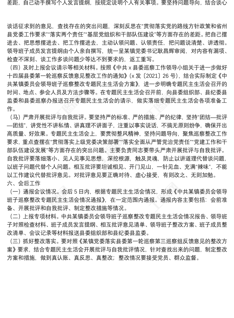 鄉鎮巡察整改專題民主生活會方案