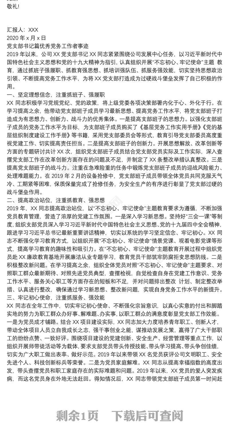 工圖網提供兩篇2020年第二季度預備黨員思想匯報與黨支部書記篇優秀黨務工作者事跡供會員免費下載。更多精彩黨課PPT素材,盡在工圖網。