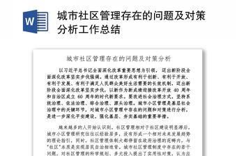 城市社區(qū)管理存在的問題及對策分析工作總結(jié) 工作總結(jié),以習(xí)近平總書記全面深化改革重要思想為指導(dǎo), 邁出新階段全面深化改革堅實(shí)步伐強(qiáng)調(diào)。通過改革