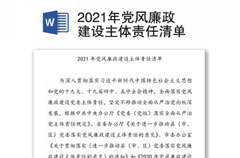 2021年黨風廉政建設主體責任清單 為深入貫徹落實習近平新時代中國特色社會主義思想和黨的十九大、十九屆四中、五中全會精神,全面落實黨風廉政建設黨委主體責任,堅定不移推動全面從嚴治黨向縱深發展,根據中共中央辦公廳《黨委(黨組)落實全面從嚴治黨主體責任規定》、省委辦公廳《關于進一步推動縣(市、區)黨委