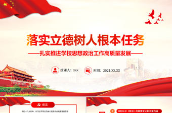 本套精美落實立德樹人根本任務PPT大氣黨政風扎實推進學校思想政治工作高質量發展黨課課件,系作者發布,編號:11973723,大小1.93MB,總共19頁,比例為16:9,由封面、目錄、轉場頁、內容、結尾5個部分構成。非常適合黨課PPT模板等場景使用。