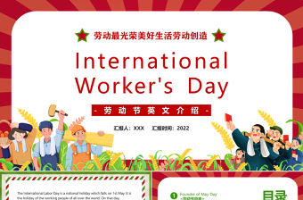 這是一套通用2022英文版五一勞動節課件PPT創意卡通風中小學生五一勞動節英文版主題班會課件模板,為作者摯愛胖坨發布,編號:12157486,體積31.87MB,共21張,比例為16:9,由封面、目錄、轉場頁、內容、結尾5個部分構成。這種敢于想象和打破常規的鬼馬個性PPT非常適合節日慶典PPT等多種應用場景。