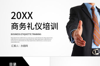 本套實用職場商務禮儀培訓ppt,是由作者qudinga123上傳,編號:34099,體積227.96MB,共34張,比例為16:9,由封面、目錄、轉場頁、內容、結尾5個部分構成。PPT采用大氣商務風的設計風格,純色背景,且能很好的突出主題色彩。雖然設計上中規中矩,整套PPT沒有特別出彩的地方,但勝在信息圖表運用的恰到好處,邏輯清晰,條理分明。本模板適用于其它PPT模板等多種場景。