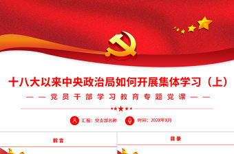 此套通用十八大以來中央政治局如何開展集體學習(上)PPT紅色黨政風黨員干部學習教育專題黨課課件,系作者伊伊很優秀發布,編號:12159462,大小9.62MB,總共22頁,比例為16:9,分為封面、目錄、過渡頁、內容、結尾5個部分。PPT以紅色做為主題色,搭配淺色背景,極為醒目。結構完整;過渡頁設計統一,使得整個PPT富有層次感。動畫設計上也做的非常精細,元素按設定規律展現,演示起來更為流暢。非常適合黨課PPT模板等場景使用。