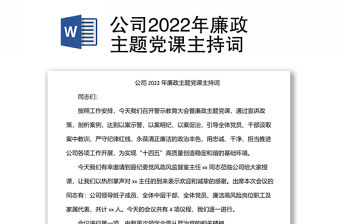 公司2022年廉政主題黨課主持詞-由作者未知的夢2009上傳,大小14.502KB,總共3頁,適用于主持詞致辭等多種場景,包含了公司2022年廉政主題黨課主持詞,公司2022年廉政主題黨課主持詞
