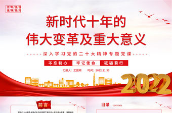 新時代十年的 偉大變革及重大意義-----深入學習黨的二十大精神專題黨課-----匯報人:工圖網 時間:2022.11.30前言黨的二十大報告全景式全方位回顧了新時代十年的偉大變革,深刻闡明了偉大變革的里程碑意義。深刻感悟這些偉大變革在黨史、新中國史、改革開放史、社會主義發展史、中華民族發展史上的里程碑意義,對于激勵全黨全軍全國各族人民奮進新征程、建功新時代具有十分重要的意義。目錄CONTENTS具有重大現實意義 和深遠歷史意義的三件大事延遲符“迎來中國共產黨成立一百周年”。中國共產