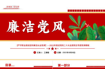 這是一套實用2022嚴守職業(yè)底線堅持廉潔從業(yè)PPT紅色黨政風廉潔黨風喜迎黨的二十大主題黨日專題黨課課件模板,由作者海普空氣能go發(fā)布,編號:12237140,大小7.7 MB,共24頁,比例為16:9,由封面、目錄、轉場頁、內容、結尾5個部分構成。PPT以紅色做為主題色,搭配淺色背景,極為醒目。結構完整;過渡頁設計統(tǒng)一,使得整個PPT富有層次感。動畫設計上也做的非常精細,元素按設定規(guī)律展現(xiàn),演示起來更為流暢。本模板適用于黨課PPT模板等多種場景。