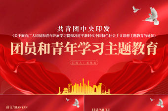 此套通用2023團(tuán)員和青年學(xué)習(xí)主題教育PPT關(guān)于面向廣大團(tuán)員和青年開展學(xué)習(xí)貫徹習(xí)近平新時(shí)代中國(guó)特色社會(huì)主義思想主題教育的通知團(tuán)課課件,由作者趙ZK發(fā)布,編號(hào):12260152,大小50.5 MB,共19張,比例為16:9,分為封面、目錄、過渡頁(yè)、內(nèi)容、結(jié)尾5個(gè)部分。這種敢于想象和打破常規(guī)的鬼馬個(gè)性PPT非常適合黨課PPT模板等多種應(yīng)用場(chǎng)景。