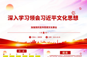此套精美2023創(chuàng)造屬于我們這個時代的自信新文化ppt紅色創(chuàng)意風深入學習貫徹習近平文化思想黨組織黨支部專題教育黨課課件,由作者海風吹過山峰發(fā)布,編號:12261343,大小7.4 MB,共18頁,比例為16:9,由封面、目錄、轉(zhuǎn)場頁、內(nèi)容、結(jié)尾5個部分構(gòu)成。PPT以紅色做為主題色,搭配淺色背景,極為醒目。結(jié)構(gòu)完整;過渡頁設(shè)計統(tǒng)一,使得整個PPT富有層次感。動畫設(shè)計上也做的非常精細,元素按設(shè)定規(guī)律展現(xiàn),演示起來更為流暢。非常適合黨課PPT模板等場景使用。