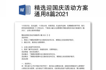 精選迎國(guó)慶活動(dòng)方案通用8篇2021-由作者秋月涼軒321上傳,大小20.1 KB,總共9頁(yè),適用于計(jì)劃方案等多種場(chǎng)景,包含了精選,迎國(guó)慶,活動(dòng)方案,活動(dòng),方案,通用,8,篇,2021