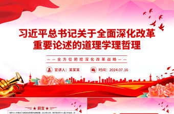 此套通用關于全面深化改革重要論述的道理學理哲理ppt全方位把控深化改革戰略,是由作者絢香﹑上傳,編號:12265611,大小7.1 MB,共22張,比例為16:9,由封面、目錄、轉場頁、內容、結尾5個部分構成。非常適合黨課PPT模板等場景使用。