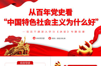 此套通用從百年黨史看“中國特色社會主義為什么好”PPT紅色黨政風黨員干部深入學習《決議》專題黨課,為作者蠟筆小新marry發布,編號:12165244,體積14.39MB,總共21張,比例為16:9,由封面、目錄、轉場頁、內容、結尾5個部分構成。PPT以紅色做為主題色,搭配淺色背景,極為醒目。結構完整;過渡頁設計統一,使得整個PPT富有層次感。動畫設計上也做的非常精細,元素按設定規律展現,演示起來更為流暢。本模板適用于黨課PPT模板等多種場景。