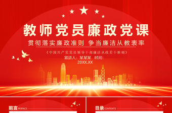 本套精美治國必先治黨治黨務必從嚴PPT黨政風始終堅持嚴的主基調廉潔廉政教育黨課課件模板,為作者鬧鬧不乖lover發布,編號:12226473,大小15.38MB,共20張,比例為16:9,分為封面、目錄、過渡頁、內容、結尾5個部分。這種敢于想象和打破常規的鬼馬個性PPT非常適合黨課PPT模板等多種應用場景。